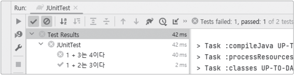 실패용 테스트 케이스를 실행하면 테스트가 실패했다는 표시와 함께 기댓값과 실제로 받은 값을 비교해서 알려준다. 이렇게 JUnit은 테스트 케이스가 하나라도 실패하면 전체 테스트를 실패한 것으로 보여준다.