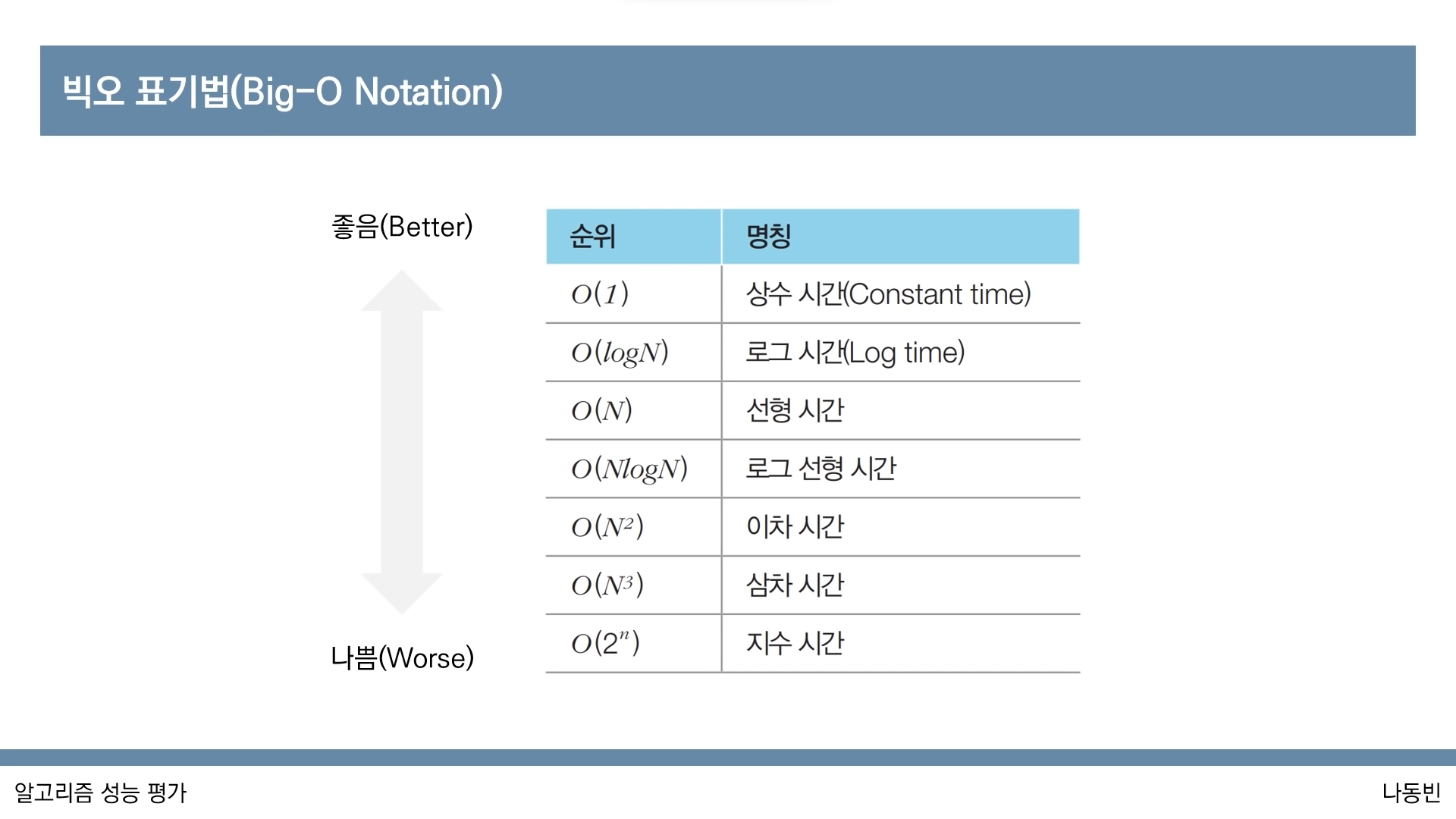 - 동일한 기능을 수행하는 알고리즘이 있다면, 일반적으로 복잡도가 낮을수록 좋은 알고리즘이다.