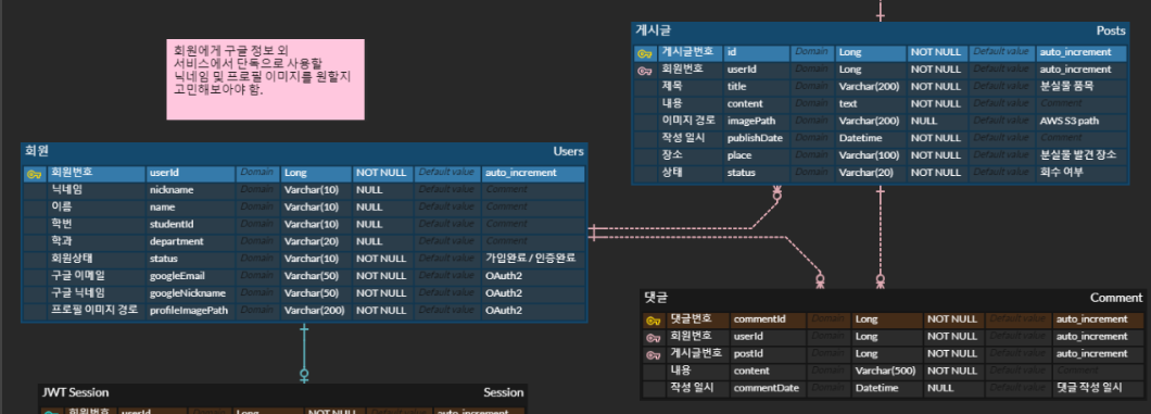 comment 테이블은 Users 테이블과 1:n관계이고, Posts 테이블과도 1:n관계이다.